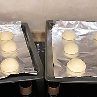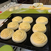 After 15 minutes, press and roll into a circle, arrange it in a baking dish and prepare for 2 fermentations. I made two plates, I used double the amount. Prepare for the second fermentation. Put the second fermentation into the oven, put a bowl of hot water in the oven, keep the humidity at 85%, and ferment for 1 hour.