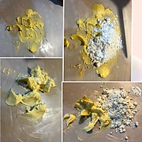 Prepare the Mexican batter when fermenting. Take 40g of butter for Mexican batter, put it on the chopping board and rub it with your hands, add powdered sugar, continue to rub it, and pour in the egg mixture several times to let the batter absorb all the egg liquid. The photo above is from left to right. The batter is fluffy at this time. Pour in the flour again, fold it with your hands and scraper, and mix evenly. Use a spatula to put all the batter into the piping bag.