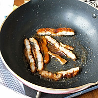 Thaw the eel and cut it into strips, heat the oil over low heat, fry for about 30 seconds and set aside, or use the oven at 190 degrees for 2 minutes or the microwave on high heat for 2 minutes