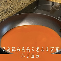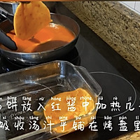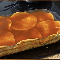 Dip the dough in the red sauce and lay it flat in a baking dish