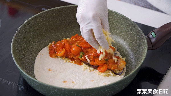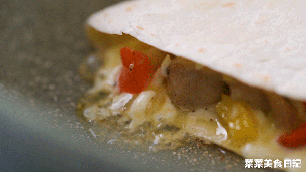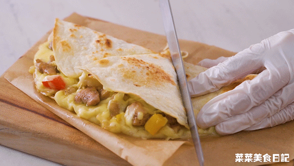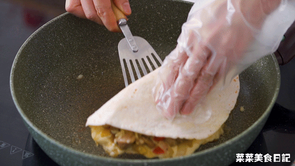 【Assembly】Brush the pan with a little oil and spread the burritos, spread the filling on half and press it with a spatula Chicken filling: minced cheese – diced chicken with bell peppers – crushed cheese – crushed basil