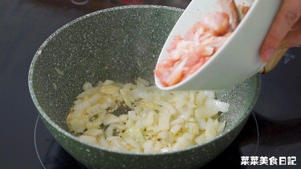 Heat oil in a pan and stir-fry minced pesto and shredded onion