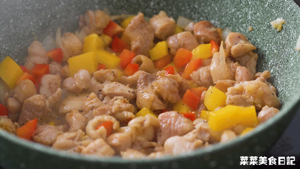 Add the marinated diced chicken and stir-fry until it changes color