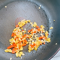 Chop the bell peppers and onions, pour a little olive oil into the pan and add the chopped onions and bell peppers and stir-fry until they change color.