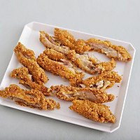 Fried chicken wings are deboned and torn into strips, slightly thicker.
