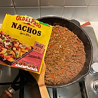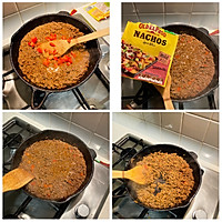 Step 4: Beef sauce preparation (any meat is fine, what is the use of me) 1. Olive oil to taste. 2. Heat the oil in a hot pan, add the minced meat, and stir-fry constantly. Add the seasoning in Figure 2. 3. Add some chopped bell peppers. 4. Stir-fry continuously until there is almost no water, as shown in Figure 4.