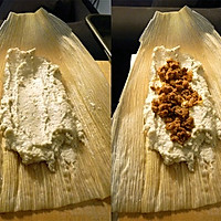 Your favorite meat (pork, chicken, beef or ground meat is fine) is also slow-cooked in advance and torn into strips or small pieces. Take a leaf and spread a thin layer of cornmeal batter with a spoon, leaving the leaves blank; Put a little meat in the middle; a little corn kernels; grated cheese; enchilada hot sauce; Finally, the triangular leaves are folded from the bottom, left and right, and the top is made of a fine corn cotyleph with a thread.