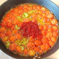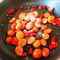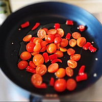 Cut the cherry tomatoes in half, cut the millet pepper into sections without removing the seeds, cut the parsley and coriander into small pieces, add the ingredients to the olive oil over low heat, and stir-fry slowly over low heat
