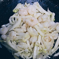 Stir-fry the shrimp in hot oil, add shredded cabbage and stir-fry over low heat, add an appropriate amount of salt.