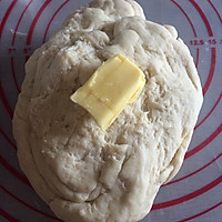 After the dough is kneaded, take it out, add the softened butter, and start kneading the butter until the dough is completely absorbed. Then start kneading, beating with a rolling pin until the dough comes out of the glove film.