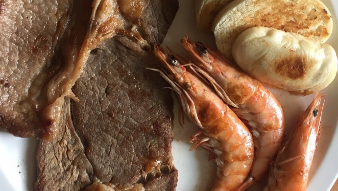 Fry the steak first, fry the first side and then fry the second side in reverse! At this time, you can put shrimp! Note that the steak should not be overcooked, fried to about 70%! It’s just the state of seeing red and not seeing blood!