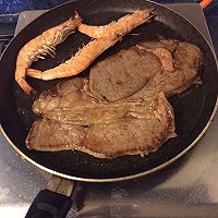 Fry the steak first, fry the first side and then fry the second side in reverse! At this time, you can put shrimp! Note that the steak should not be overcooked, fried to about 70%! It’s just the state of seeing red and not seeing blood!