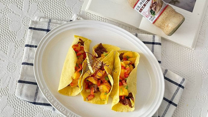 Hang the tortilla on the oven net and bake at 150 degrees for 5 minutes. Layer the bottom with beef and top with mango salsa sauce, and you’re done