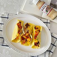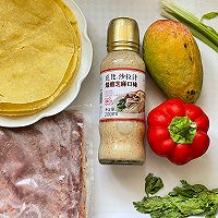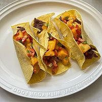 Hang the tortilla on the oven net and bake at 150 degrees for 5 minutes. Layer the bottom with beef and top with mango salsa sauce, and you’re done