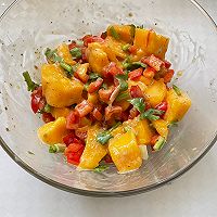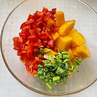Peel and pit the mango and dice it, wash and dice the red pepper, and cut the coriander into small pieces.