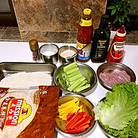 Prepare all the ingredients, cut the cucumber into small pieces, cut the bell pepper into strips, wash the lettuce and drain the water. Cut the tenderloin into strips and marinate with a little salt, black pepper, chicken powder, water, and cornstarch for ten minutes (add water in small quantities and mix evenly).