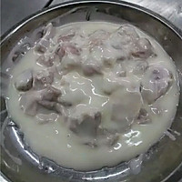 Raw material: 250 grams of chops. Seasoning: Salt, homemade strawberry juice. Make: 1. Rinse off the blood, absorb the water, add a little salt and mix well, and hang the crispy paste.
