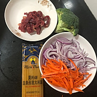Cut the beef into strips, add starch, pepper, a little salt, shred the onion and carrots, cut the broccoli into flowers one by one, and set aside