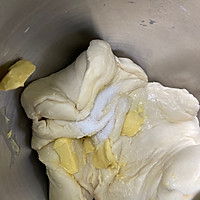 The chef machine first stirs at low speed to form a ball, then turns to high speed to knead until it is thick, adds butter and salt, and continues to knead until the dough is smooth.