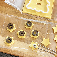 Use cheese slices and molds to make your favorite shape. The flower shape is black olives, and the star shape is eye sugar.