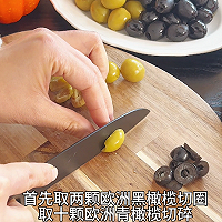 Take two European black olives and cut them into rings, and chop ten European green olives.