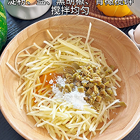 Put shredded potatoes, eggs, starch, salt, black pepper, and chopped green olives in a bowl and stir well.