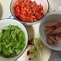 Tomatoes, ham, cut for later use, green onion, ginger, garlic, dried chili peppers and set aside
