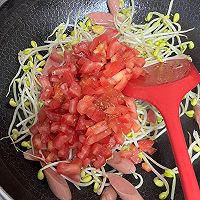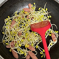 Heat the oil in a pan, first add green onion, ginger, garlic and chili peppers and sauté until fragrant, then add ham, soybean sprouts, and stir-fry