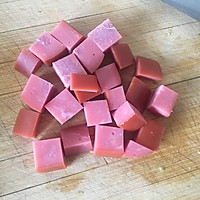 Add a little vegetable oil to the pan, add the ham cubes and stir-fry.