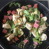 Add a little vegetable oil to the pan, add the ham cubes and stir-fry.