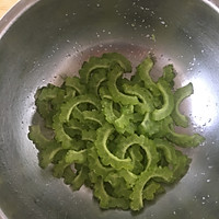 Half a bitter gourd is scooped out of the seeds (try to remove the white film as much as possible) and cut into thin slices.