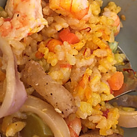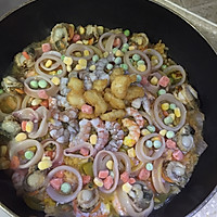 Add seafood, you can also add other things you like to eat, such as ham and beans (you can press the seafood slightly into the rice, but don’t turn it over, otherwise it will become mushy…) Simmer for another 5-10 minutes until all the juice is dry