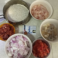 Pour the onion tomato, Spanish salami, paella rice into the pot, then add the saffron (I bought paellero’s special powder directly), stir well Add an appropriate amount of salt, an appropriate amount of oil, a little pepper and a little white wine Continue to stir well, add water and start cooking (I burned it directly in the rice cooker)