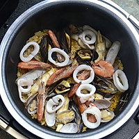 In the last 10 minutes or so of the rice, put the previously processed seafood into the rice one by one until the end of the time, and finally add a little lemon and minced coriander to taste