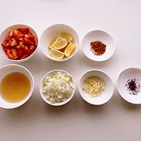 Blanch the tomatoes in hot water, peel them, cut them into small cubes, mince the garlic, dice the onion, and cut the lemon into slices.
