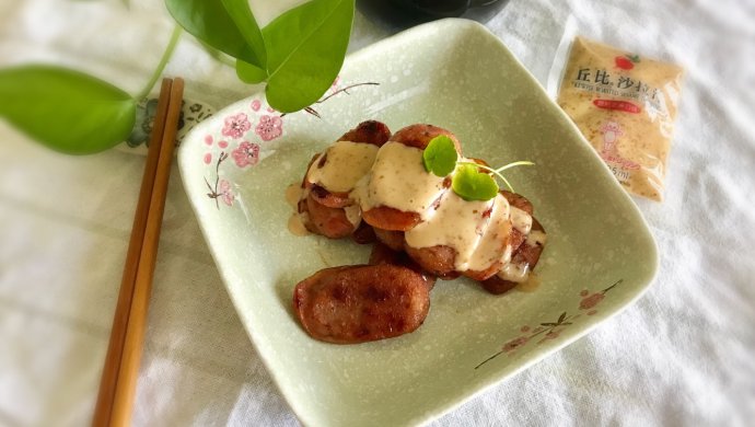 If the whole sausage is fried, it will take longer, and the time can be greatly reduced after slicing. It is a good choice with Kewpie’s salad dressing.