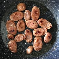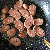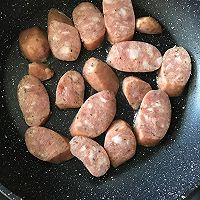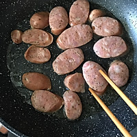 The sausage will produce oil when frying. Fry until the sausage is slightly shrunk and bulging, turn over