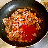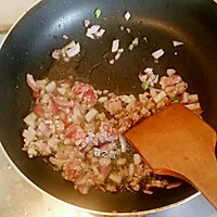 Pour an appropriate amount of olive oil into a pan, add minced meat and onions and stir-fry until fragrant