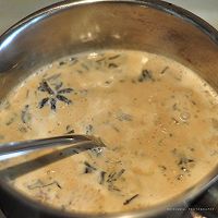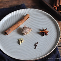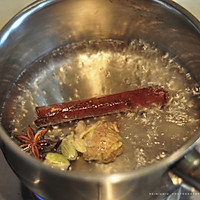 Add 250g of water to the pot, bring to a boil over high heat, add cinnamon rolls, ginger, cloves, star anise, cardamom, bring to a boil, turn to low heat, and continue to cook for 5 minutes