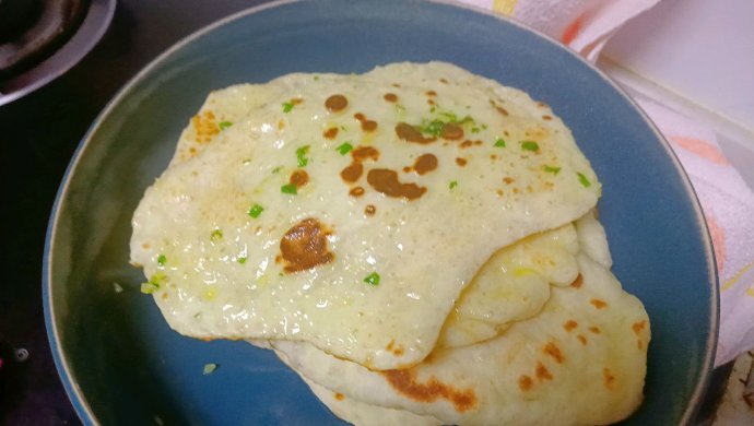 Lay flat on a pan (no oil) until the dough is bulging, turn over.