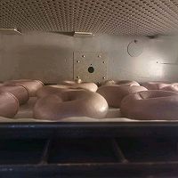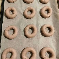 After relaxation, the bagel is rolled up from top to bottom to form a short cylinder, and continues to moisturize and relax at room temperature for 10 minutes. This relaxation process can also be carried out refrigerated for 30-60 minutes. The bagel is finally shaped: a short cylinder after relaxation, rubbed with both hands to a length of 26 to 28 cm. The seal is upward, and one end is flattened by hand about 2 cm, and rolled into a fan shape with a rolling pin. Wrap the other end around a circle and connect it to this end, and seal the connection. Arrange into a round seal and place it down on a baking sheet. The secondary fermentation temperature is 30 degrees, the humidity is 75% to 80%, and the time is about 50 minutes. In summer, it can be directly covered at room temperature for moisturizing secondary fermentation.