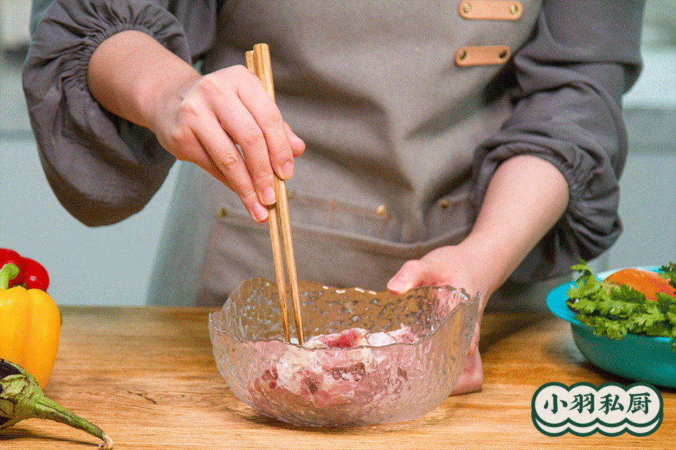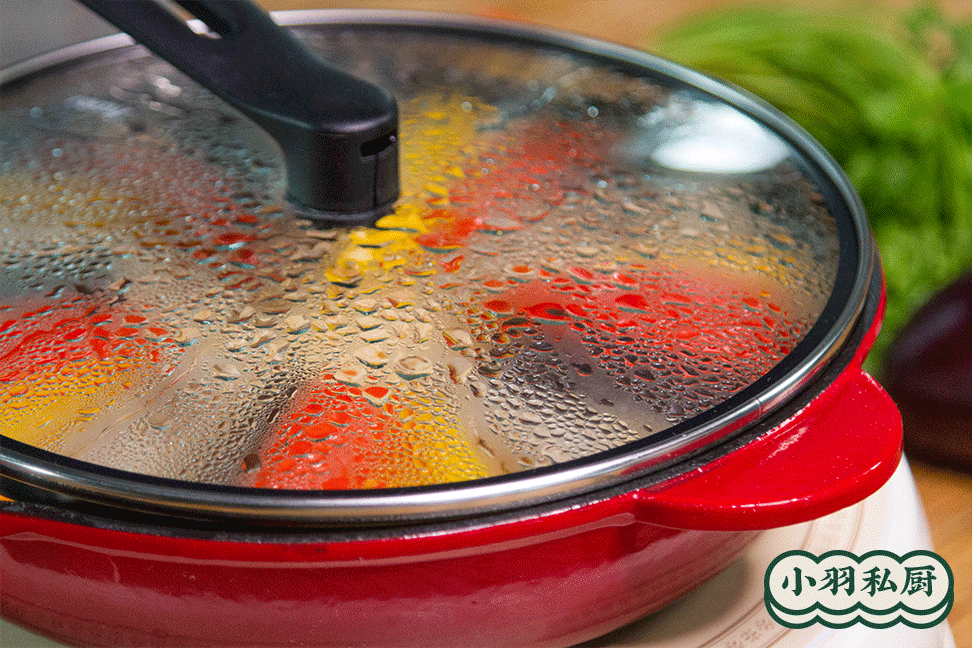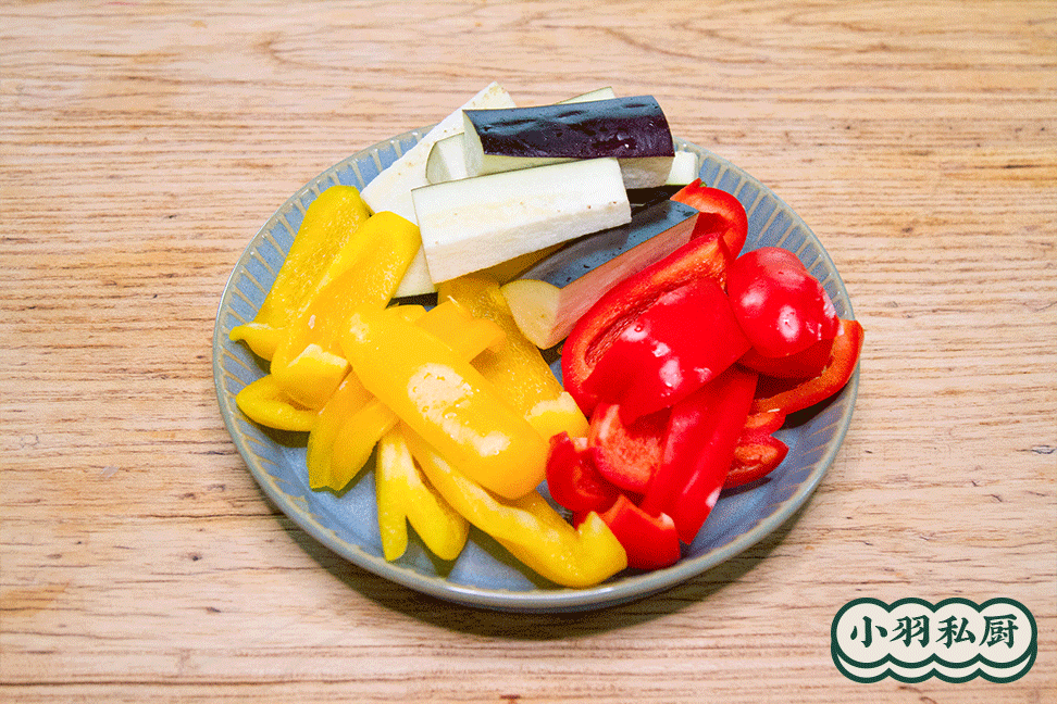 Add red peppers, yellow peppers, and eggplants, add 2 grams of salt and fry until soft, and set aside.