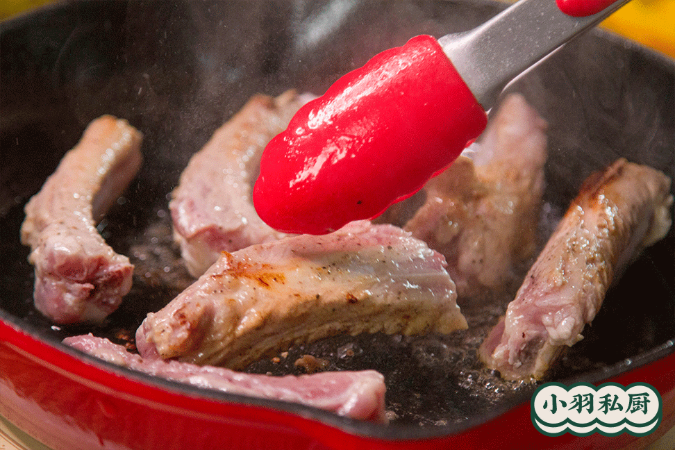 Pour oil into a pan and heat it, add the ribs and fry until the surface is slightly yellow.