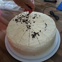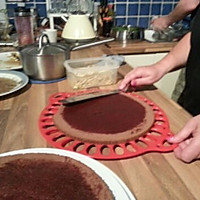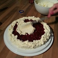 Spread the mixed sauce evenly in the middle of the cake layer. Leave some empty space around. The first layer is prepared as well as the second