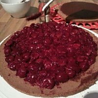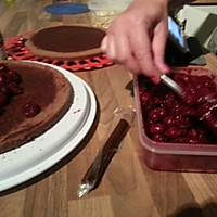 Wow~ What a tempting cherry sauce, this is a sauce with cherries, spread it on the cake layer and cover the place where the sauce was just spread. Cherries should not overlap, but be compact. The first and second layers of cake are treated the same.