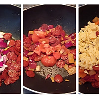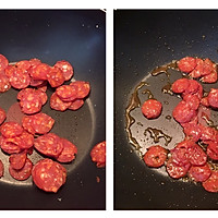 After that, no more oil is put in the pot, just stir-fry the left sausage and stir-fry the red oil in the sausage