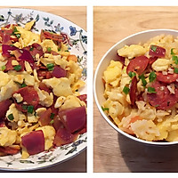 Then add the onion and stir-fry, then add the tomatoes, and when the tomatoes are soft, add the previously scrambled eggs and stir well. If you like tomatoes, you can add two tomatoes and stir-fry, or you can add some tomato sauce and stir-fry them together