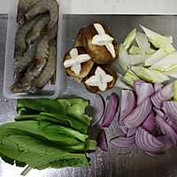 Shrimp remove shrimp gun, shrimp line, shrimp feet Shiitake mushroom cutter knife Cut the green onion into sections with a hob Greens are all in two sections Cut the onion into long strips