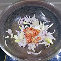 Pour oil into a hot pan, add onions and green onions and stir-fry slightly yellow until fragrant