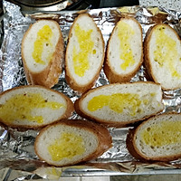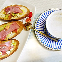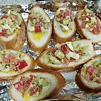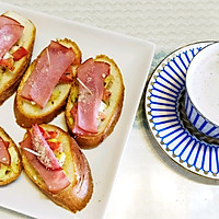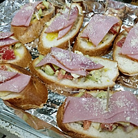 Add ham on top, cheese powder, if there is mozzarella cheese is best, sprinkle on top, fix the ham with a toothpick, put in the oven, 180°, about 8 minutes.